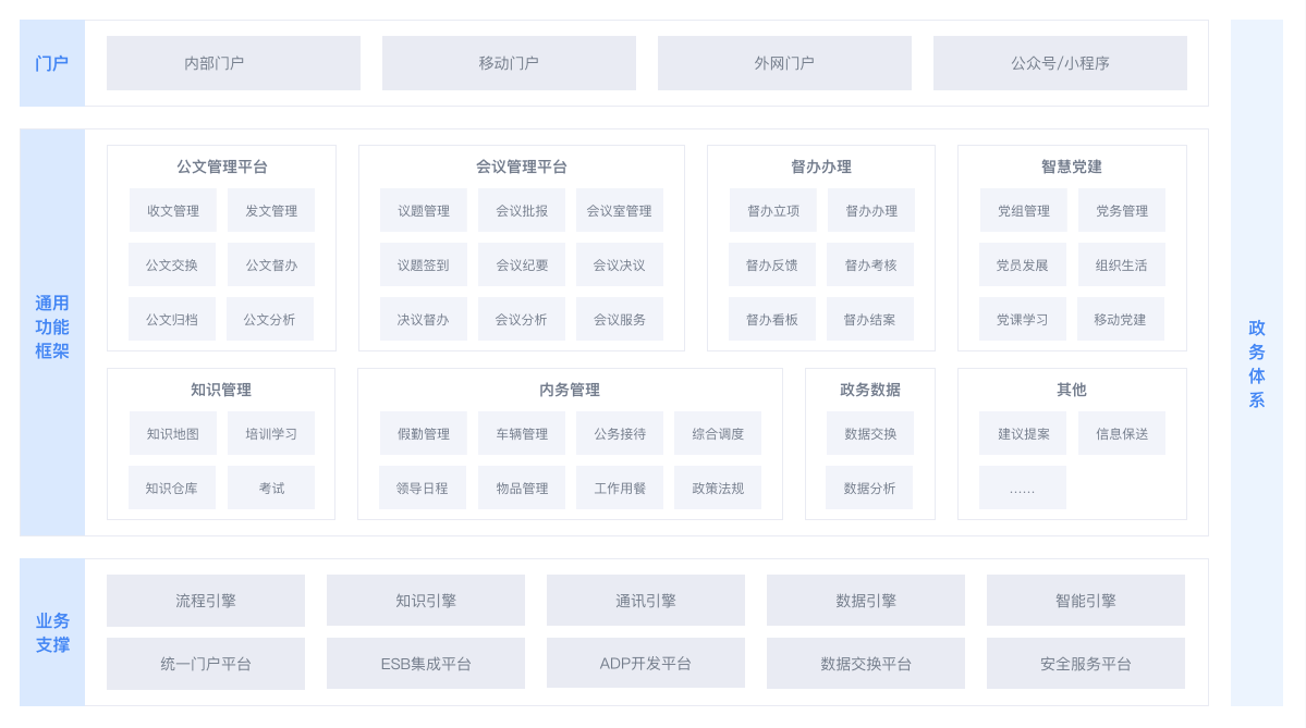主要用于政府部门收发文管理、文件交换、综合办公、协同办公等业务管理的全程一体化电子化管理,满足政务安全需求,配备即时通讯、运维监控等辅助功能。